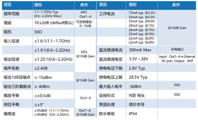輸出駐波:≤1.25:1(0.6~2.2GHz)